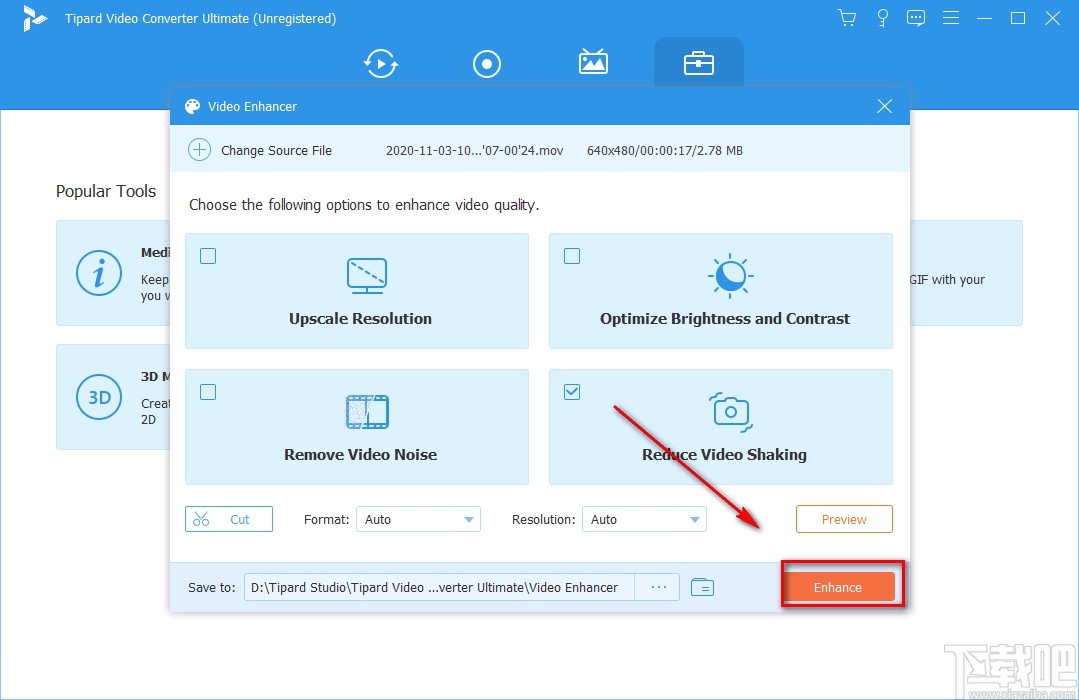 8.完成以上所有步骤后,我们在窗口右下角找到黄色的“Enhance”按钮,点击该按钮就可以给视频减震了。
