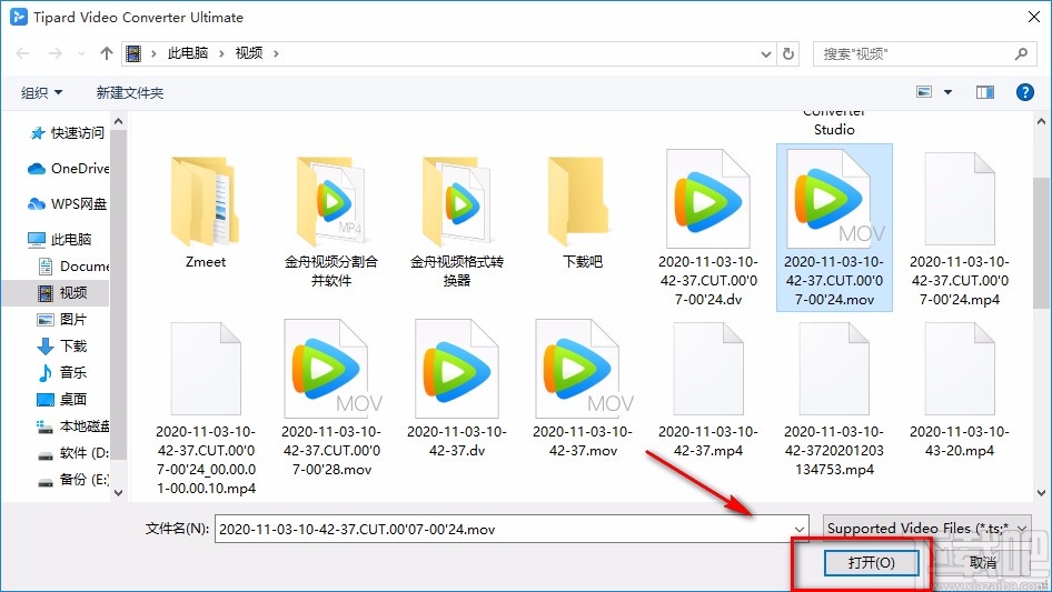 4.在文件添加页面中,我们选中需要减震的视频,再点击页面右下角的“打开”按钮即可。