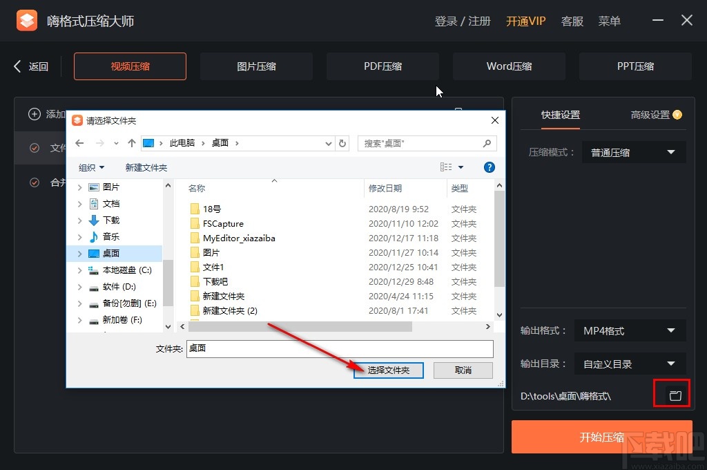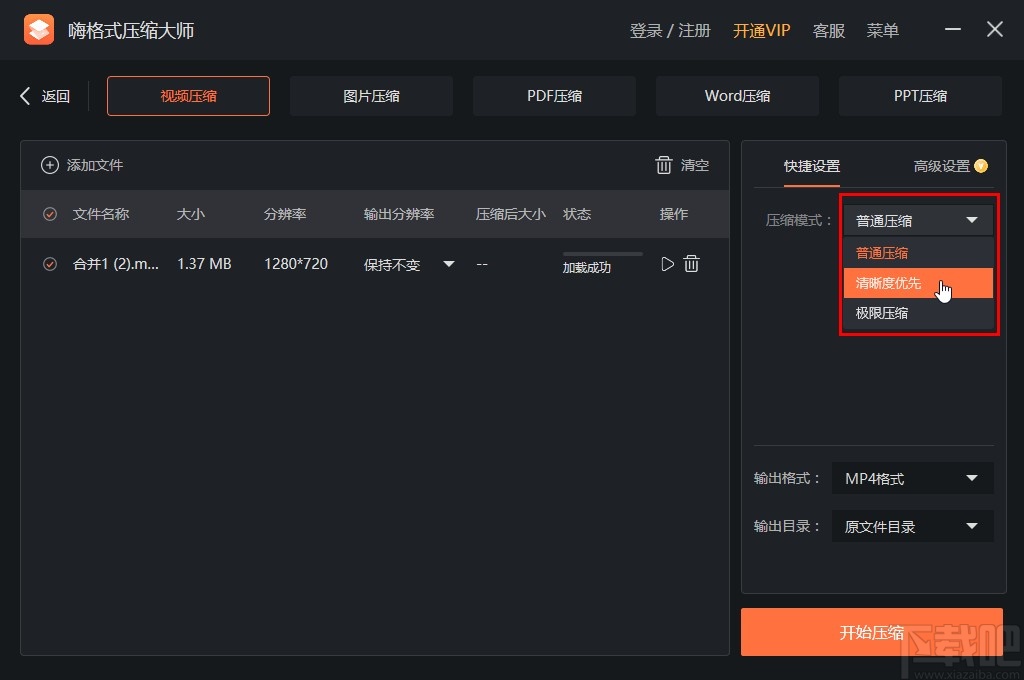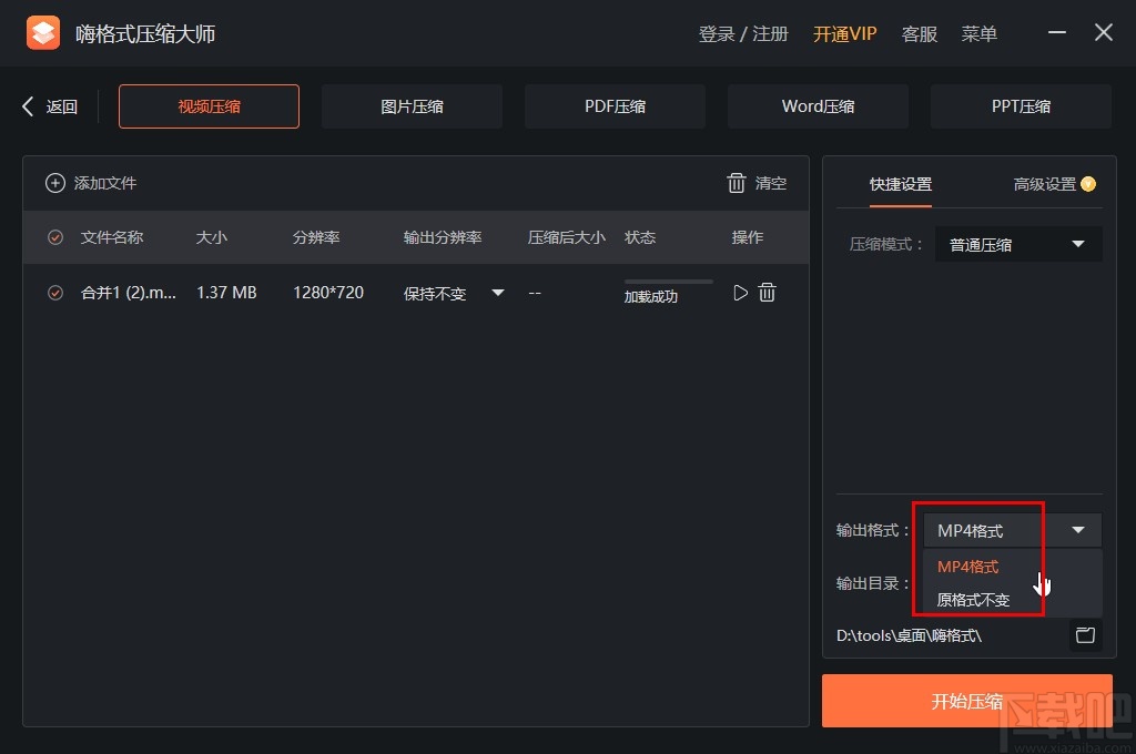 6.选择好压缩模式之后,接下来下一步在右下角可以看到输出格式选项,可以选择输出为MP4格式或者是保持原格式不变。