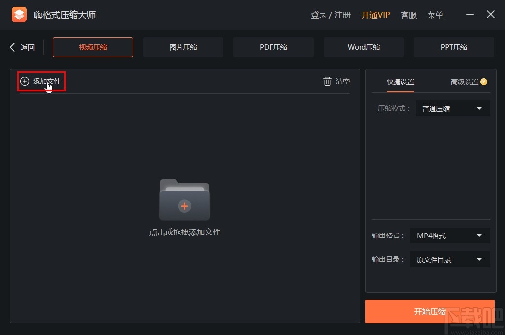 2.进入到视频压缩界面之后,我们可以点击界面左上角的添加文件选项,点击这个添加文件选项之后进入到添加文件的操作中。