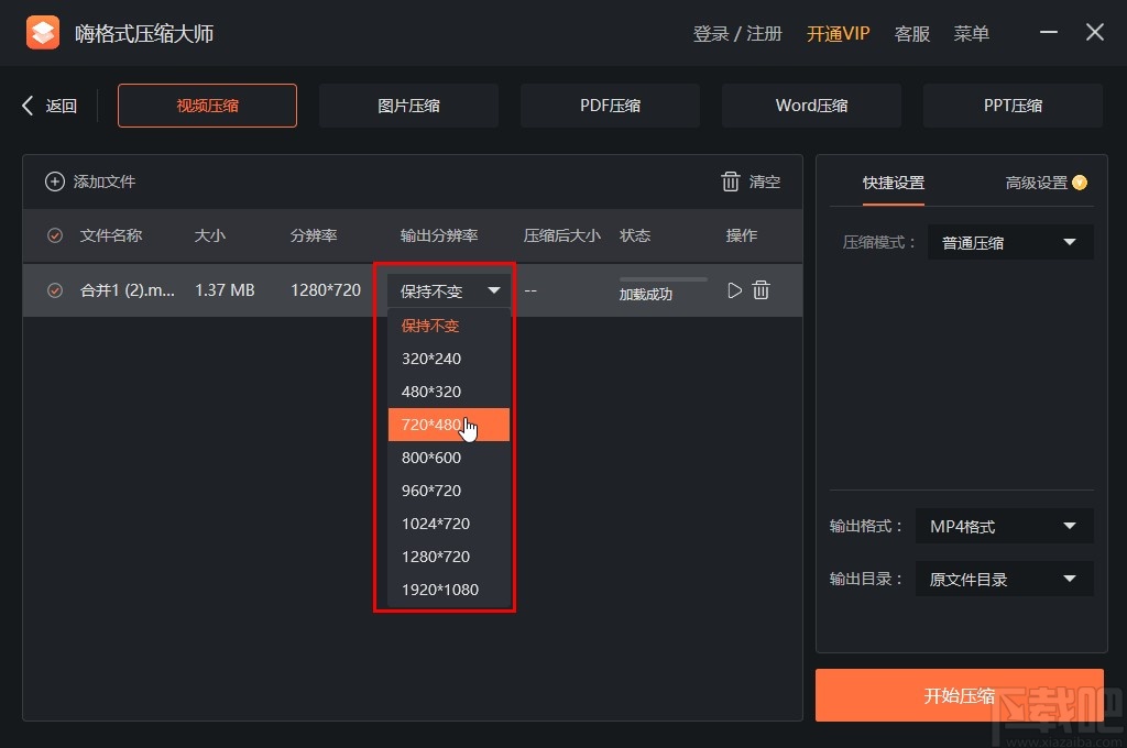 5.设置输出分辨率之后,下一步可以在右边的压缩模式中,点击下拉列表选项来选择想要使用的压缩模式。