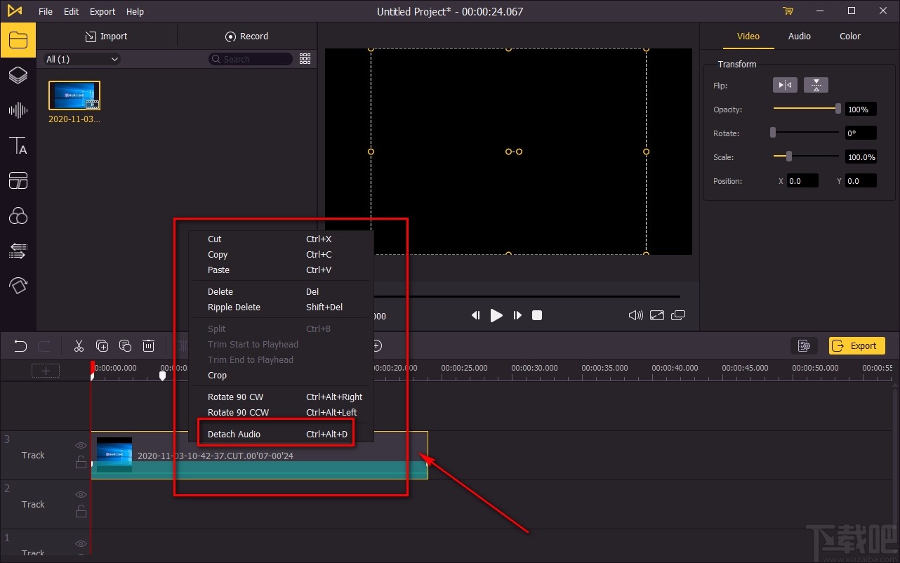 4.然后在时间线上选中视频,这时候点击鼠标右键,界面上会出现一个下拉框,我们在下拉框中选择“Detach Audio”选项,该选项表示提取音频的意思。