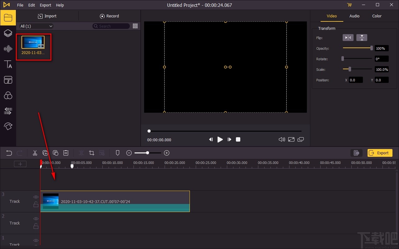 3.接着在界面左上方选中视频,再用鼠标将其拖拽到下方的时间线上,如下图所示。
