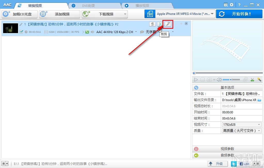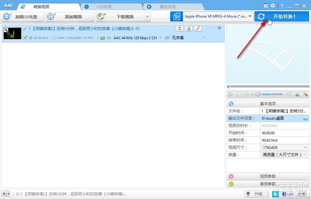 7.最后设置好输出路径之后,点击界面右上角的这开始转换按钮,点击这个开始转换按钮就可以开始将裁剪之后的视频保存下来了。