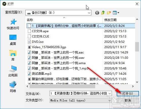2.点击添加按钮之后,接下来下一步会出现一个选择文件的界面,在这个界面中选中想要处理的视频文件之后,点击右下角的打开按钮。