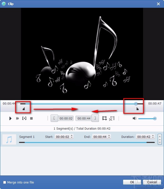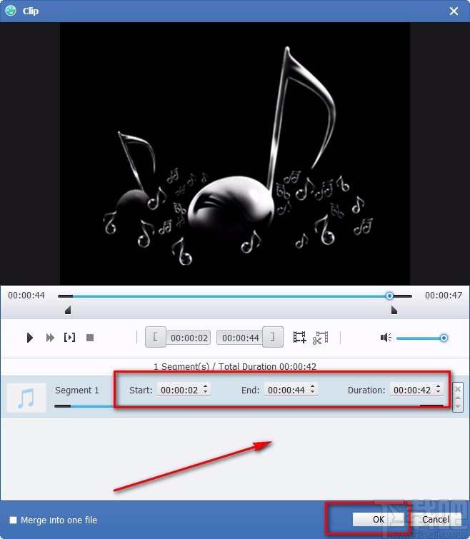 5.然后在窗口下方就可以查看到音频剪切的开始时间和结束时间,还能查看到剪切后的音频时间长度;这时候点击窗口右下角的“OK”按钮,即可返回到软件主界面。