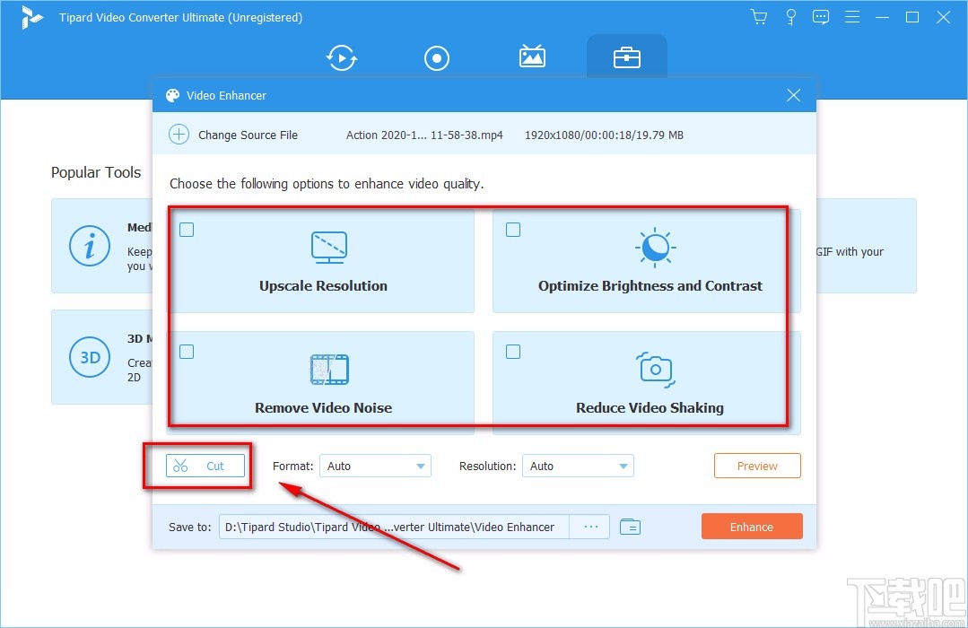 5.然后在视频优化窗口中取消勾选下图中用红色方框圈起来的四个选项,并点击窗口左下角的“Cut”按钮即可。