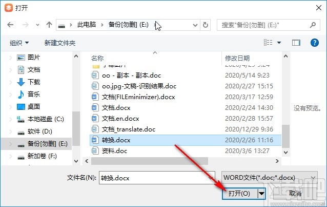 3.点击添加文件之后,接下来下一步界面中会出现选择文件的窗口,我们在这个窗口中找到目标word文件之后,点击右下角的这个打开按钮即可。