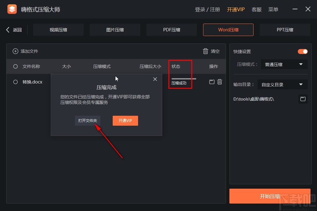 7.最后等待压缩完成之后,可以看到压缩后的大小,在状态一栏也显示为压缩成功,这样就表示已经成功压缩word文件了,点击提示窗口中的打开文件夹按钮可以打开输出目录查看压缩后的文件。
