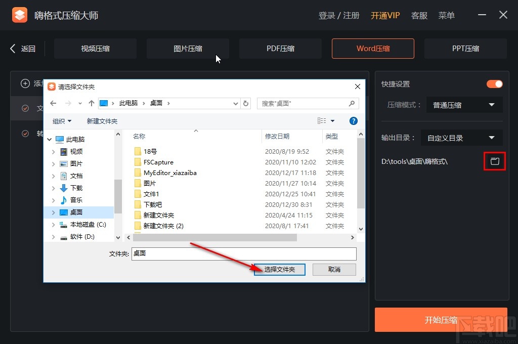 5.选择好想要使用的压缩模式之后,我们在界面中将输出目录设置为自定义目录,然后点击文件夹图标在打开的选择输出目录界面中,根据自己的需求来选择输出目录。