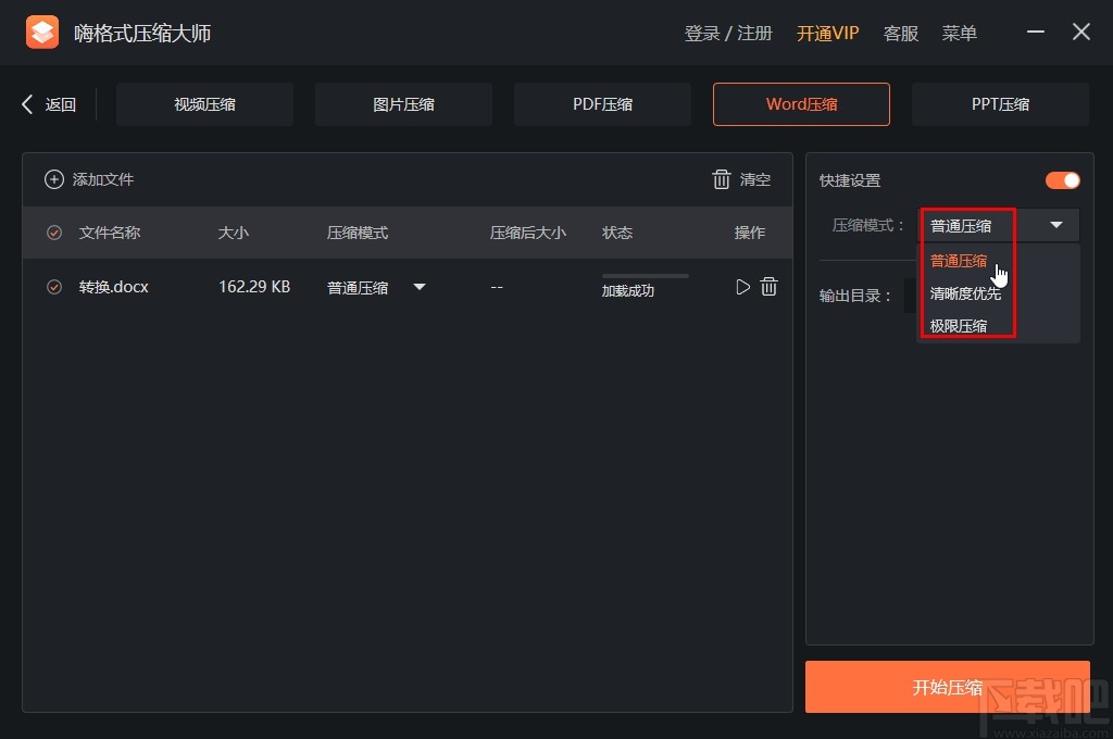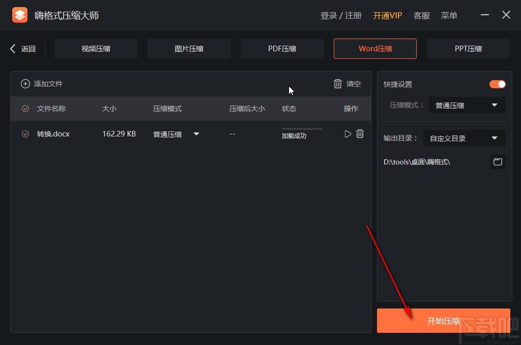 6.设置好输出目录之后,我们就可以点击软件界面右下角的开始压缩这个功能按钮开始压缩word文件的操作了。