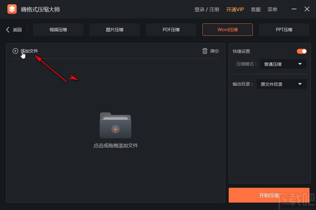 2.点击进入到word压缩功能界面之后,我们点击界面左上方的添加文件这个功能选项,点击之后可以选择想要压缩的word文件。