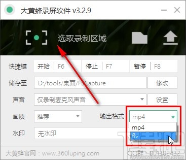 5.选择好录制的画质之后下一步使用同样的方法设置输出格式,也就是录制的视频保存格式,设置之后点击上方的选择录制区域选项。