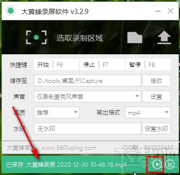 9.最后停止录制之后我们在下方可以看到一个已保存的提示,点击右边的播放按钮可以播放录制的视频进行查看。