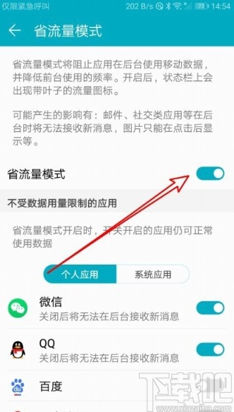 5.最后在省流量模式的功能设置界面,找到这个功能选项右边的开关,将开关打开显示为开启状态就可以了。