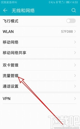 3.下一步进入到无线和网络设置界面之后,在界面中可以看到有流量管理这个选项,点击之后进入到流量管理界面。