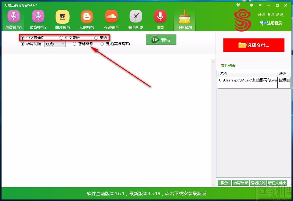4.将文件添加到软件后,我们在界面上方找到“中文普通话”、“中文粤语”以及“英语”三个选项,根据自己的需要进行选择就可以了。