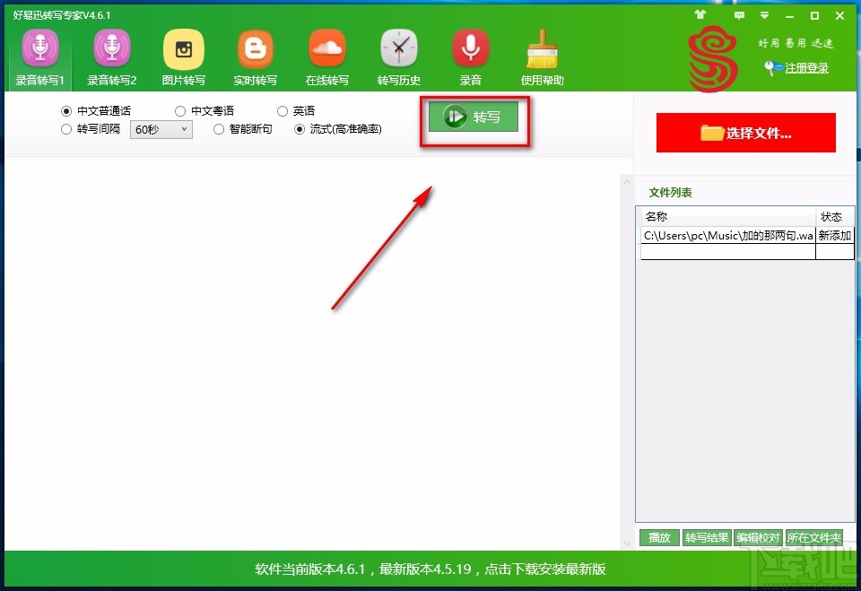 6.完成以上所有步骤后,我们在界面上方找到“转写”按钮,点击该按钮就可以开始将语音转为文字了。