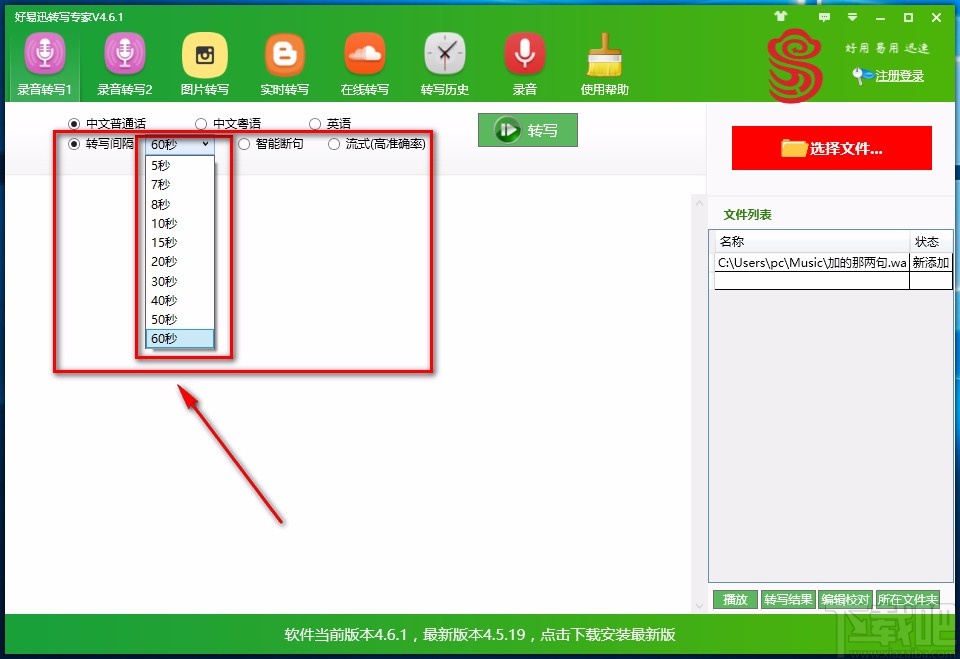 5.然后在界面上方找到“转写间隔”、“智能断句”以及“流式”选项,我们根据自己的需要进行选择;如果选择“转写间隔”,则还要点击其后面的下拉按钮,在下拉框中设置间隔时间。