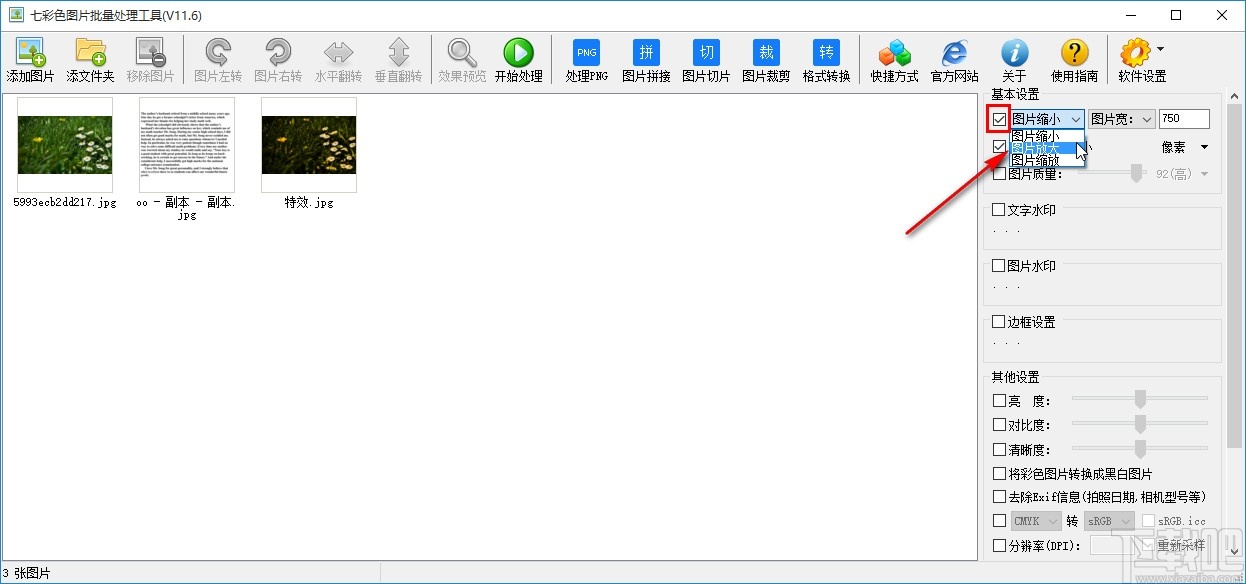 3.点击打开按钮成功添加图片到软件之后,我们在界面的右边找到基本设置这个模块,然后勾选图片缩小这个选项,点击下拉列表之后选择图片放大或者缩小,也就是我们想要调整大小的方式。