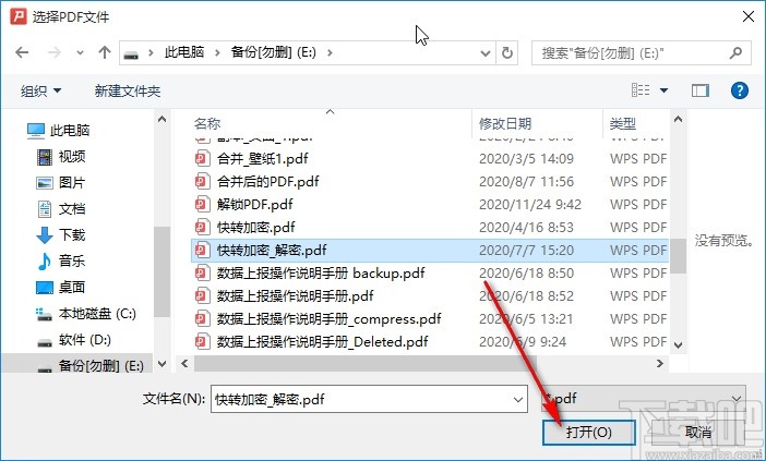 3.点击添加文件按钮之后,接下来下一步就会打开一个选择文件的界面,在这个界面中我们选中目标PDF文件之后,点击右下角的打开按钮。
