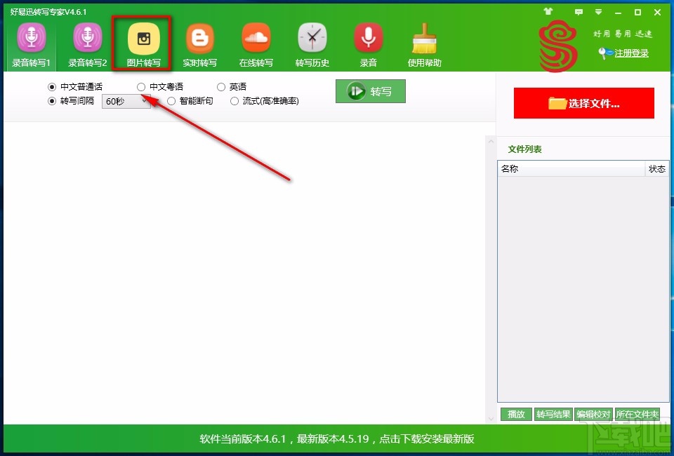 2.接着在图片转写页面中,我们在页面上找到“选择文件”按钮,点击该按钮就可以进行下一步操作。