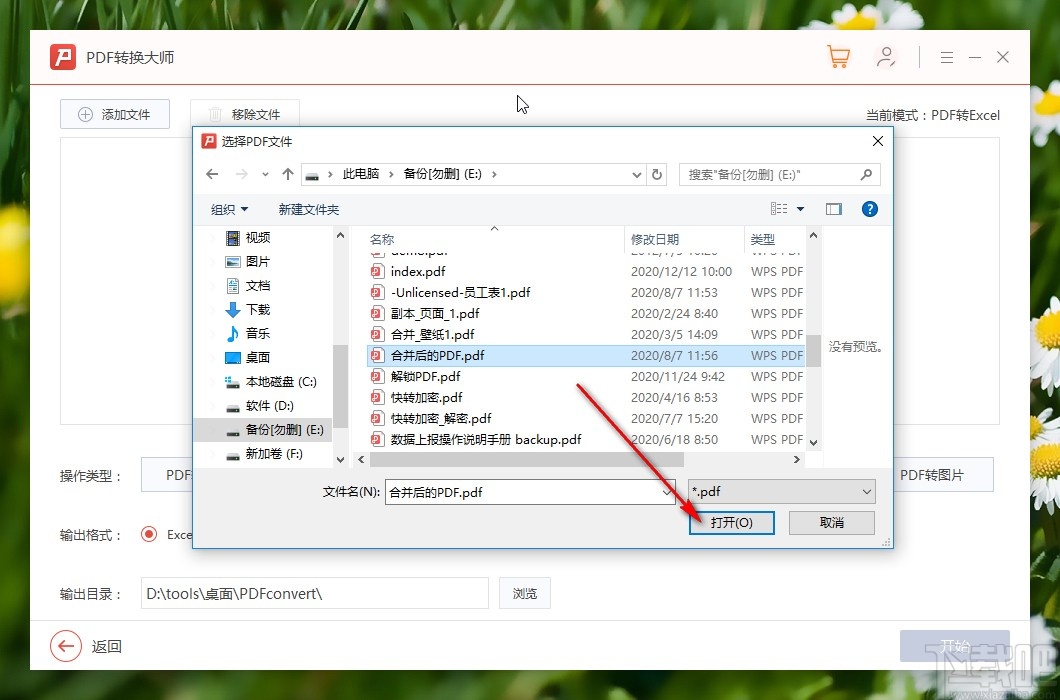3.点击这个添加文件按钮之后在出现的界面中找到想要转换的PDF文件选中之后点击右下角的打开按钮即可打开文件。