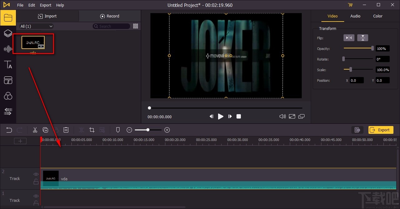 3.将视频文件添加到软件后,我们在界面左上方选中视频并拖动鼠标,将其添加到下方的时间线上。