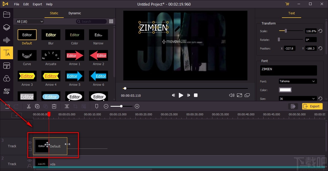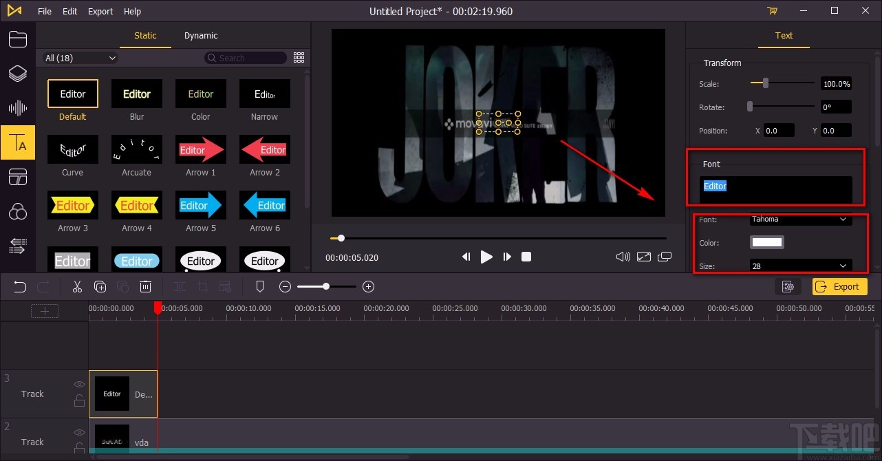 6.紧接着在界面右侧就会出现字幕编辑窗口,我们在“Font”文本框中输入字幕内容,再利用其下方的“Font”、“Color”、“Size”等工具,来设置字幕的字体、颜色、字号等。