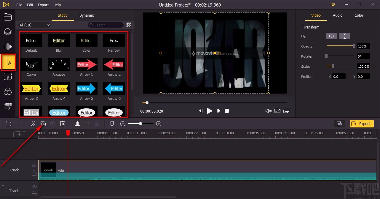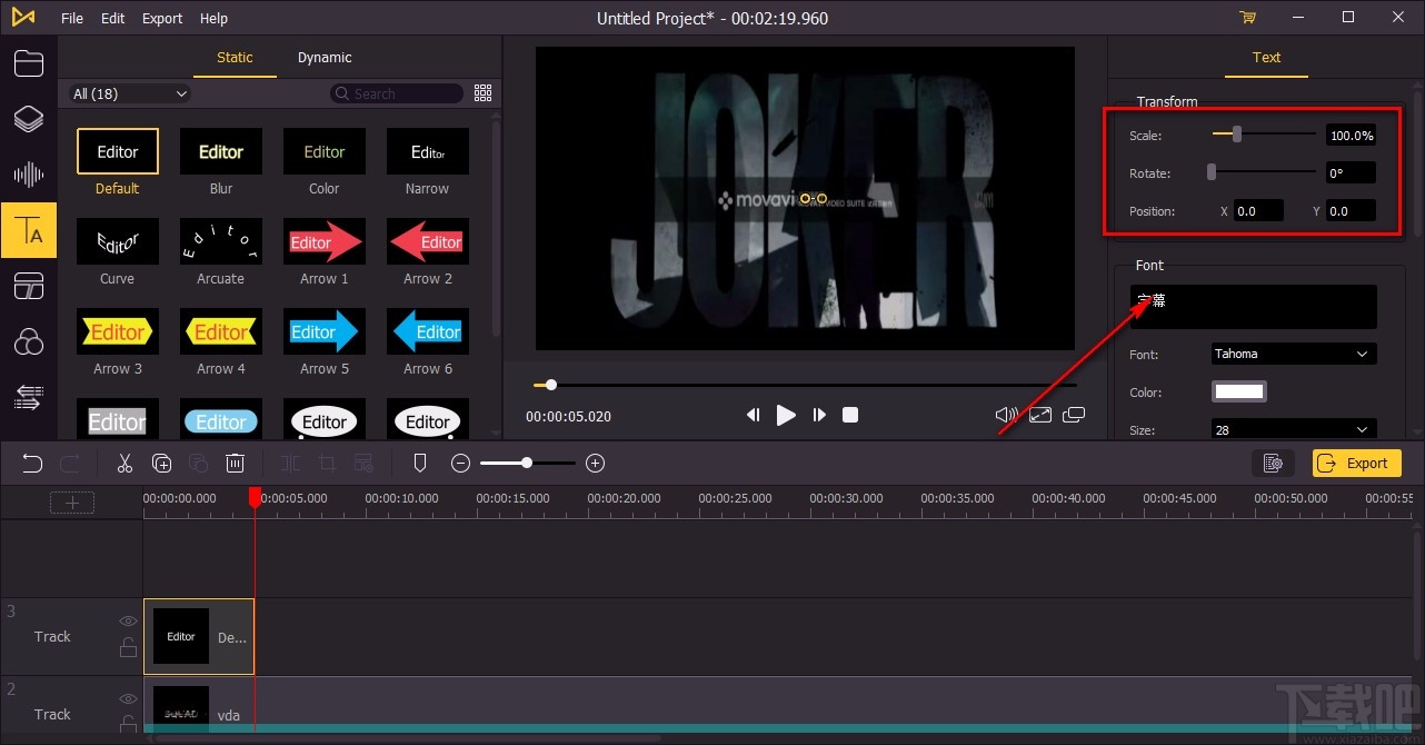 7.在界面右上方还可以找到“Scale”、“Rotate”和“Position”选项,分别表示规模、旋转以及位置的意思,根据自己的需要对字幕的规模大小、旋转角度以及位置进行设置即可。