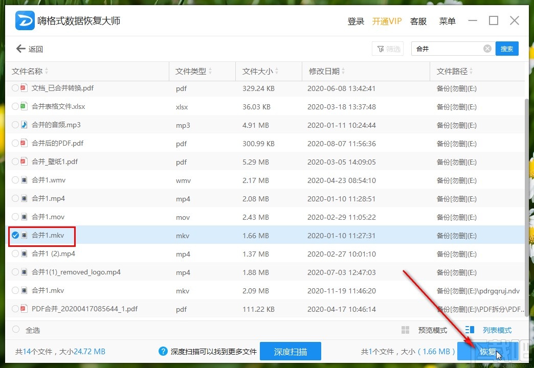 5.最后我们找到想要恢复的文件,点击选中左边的小圆圈之后,点击右下角的这个恢复按钮恢复文件即可。