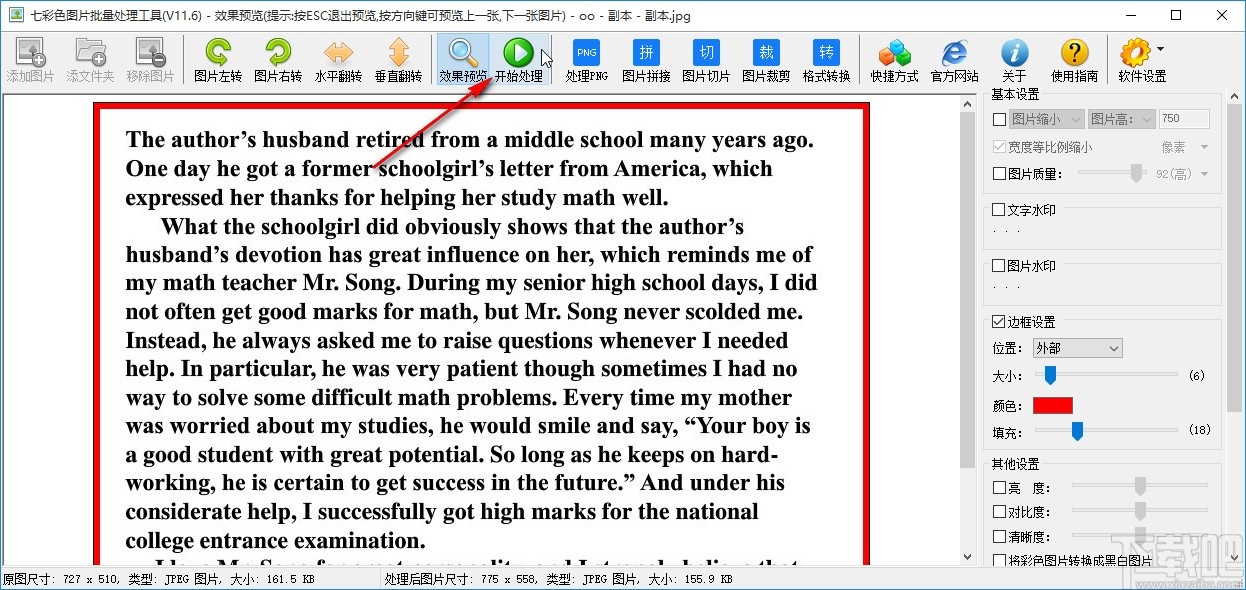 8.添加边框的效果满意之后,最后一步我们点击界面上方的开始处理这个功能图标就可以开始对图片的边框进行添加了,如下图中所示。