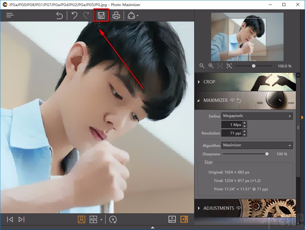 9.完成以上所有步骤后,我们在界面上方找到保存按钮,点击该按钮就可以将放大后的图片保存在电脑中了。