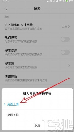 5.进入到这个搜索快捷手势的设置界面,可以看到有桌面上滑和桌面下拉两个选项,我们根据自己的需求选择想要使用的即可,比如选择桌面上滑的话,在操作手机时上滑桌面就可以调出搜索界面了。