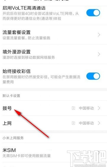 3.下一步进入到双卡和移动网络这个设置选项界面之后,找到界面中的默认卡设置这个模块,然后找到拨号这个设置选项进入到拨号默认卡设置界面。