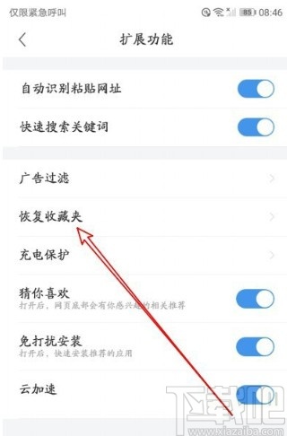 4.接下来在扩展功能界面就可以看到有恢复收藏夹这个选项了,找到这个选项之后点击进入到其中。