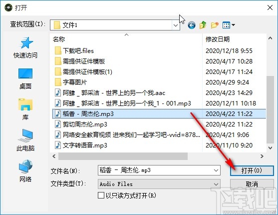 4.点击这个添加外部音频选项之后,在出现的选择音频文件界面,选中音频之后点击右下角的打开按钮即可。