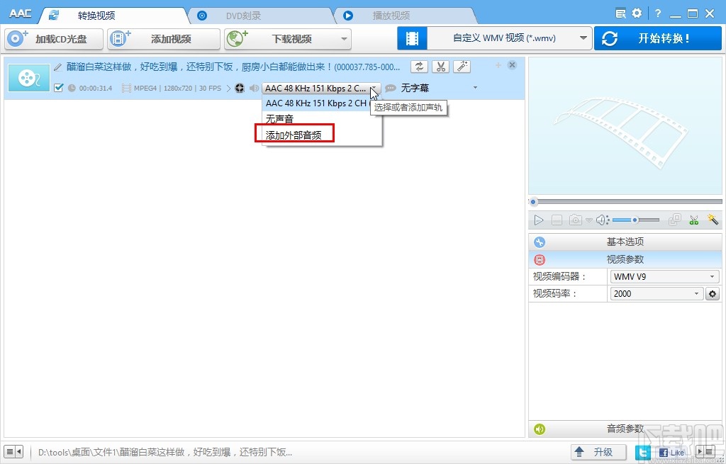 3.成功添加视频文件到软件界面之后,我们点击视频选项的音频,然后在出现的列表中选择添加外部音频选项并点击。