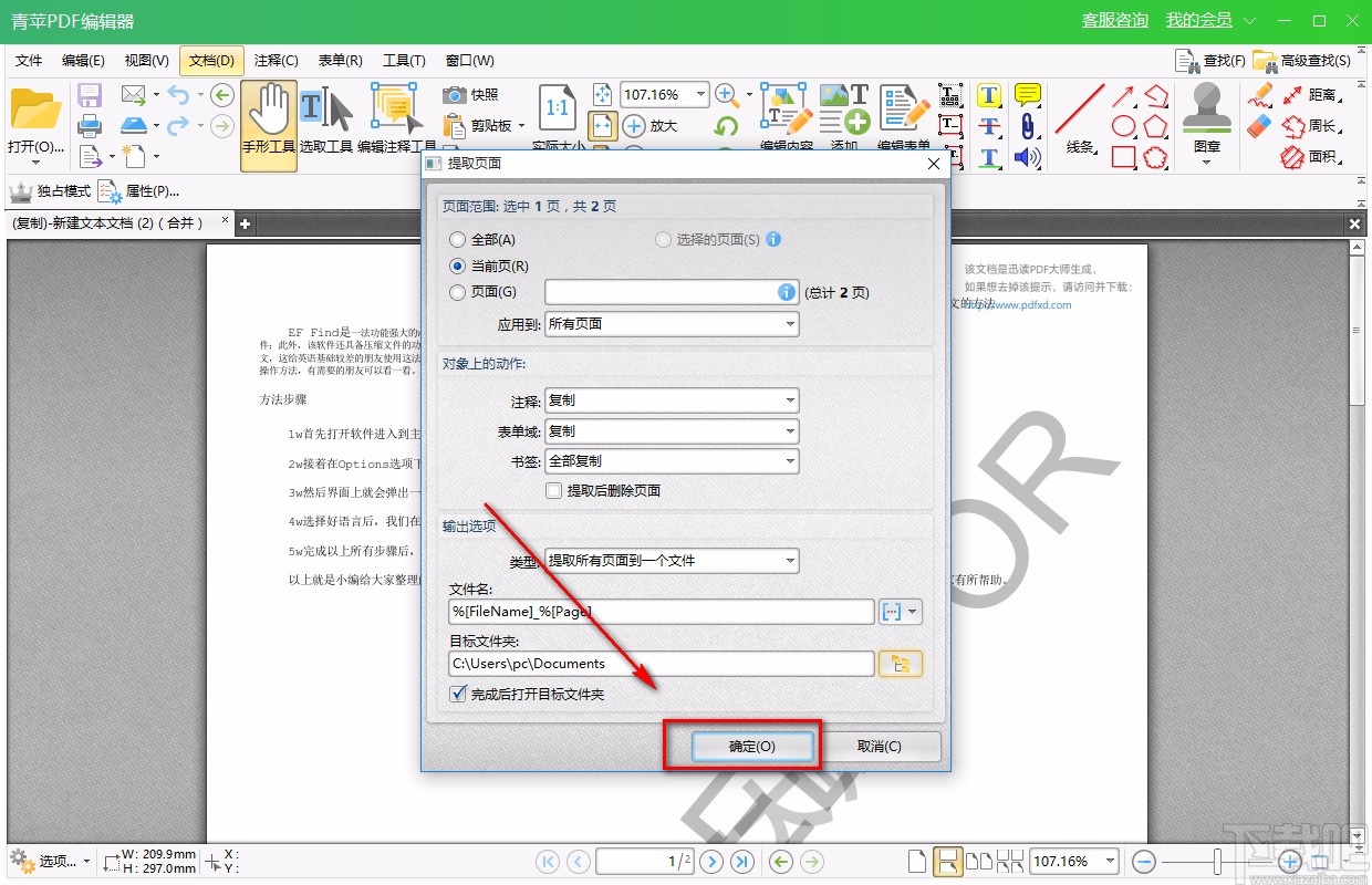 10.完成以上所有步骤后,我们在窗口底部找到“确定”按钮,点击该按钮就能够成功提取PDF页面了。