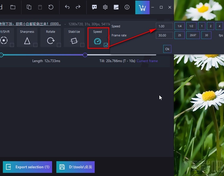 3.点击打开按钮成功添加视频到软件界面之后,在界面中找到Speed这个速度设置选项,然后勾选它的方框就可以准备进行速度的调整,在出现的界面中speed这一行右边可以根据自己的需求来输入速度数值。