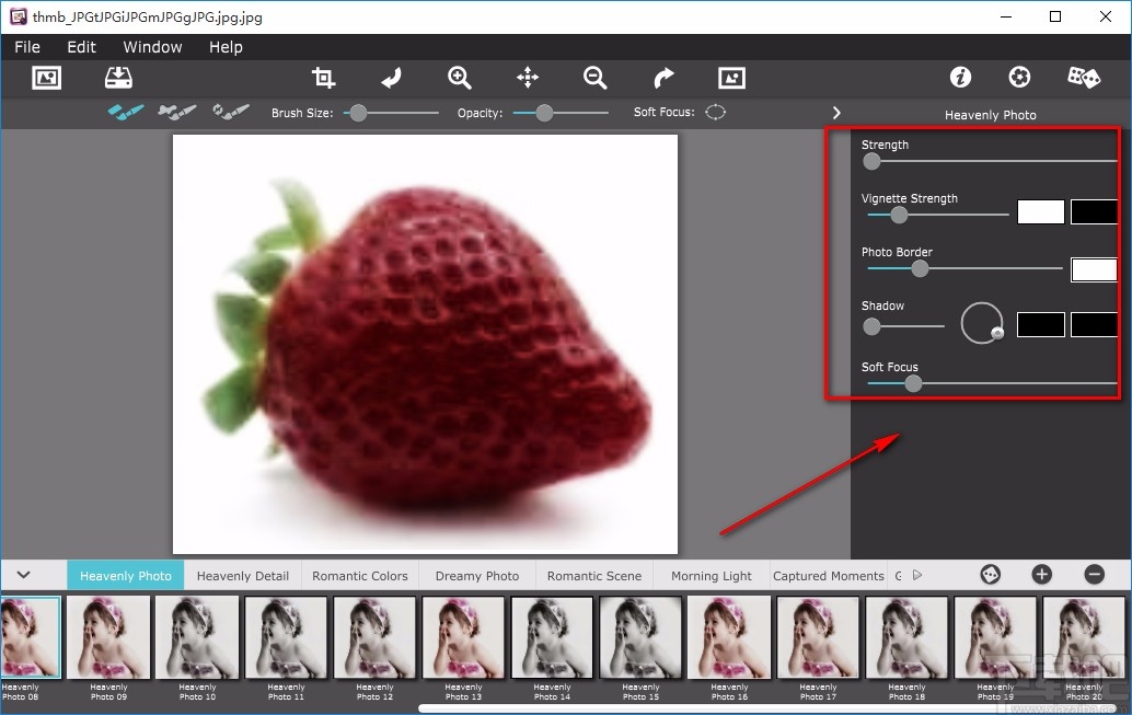 4.在界面右侧还可以找到“Strength”、“Vignette Strength”、“Photo Border”、“Shadow”以及“Soft Focus”几个选项,分别表示强度、暗角强度、图片边缘、阴影以及软焦点的意思,我们根据自己的需要对这几个参数进行调整。