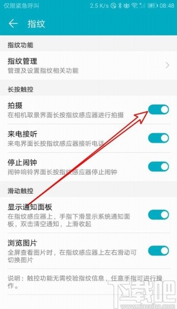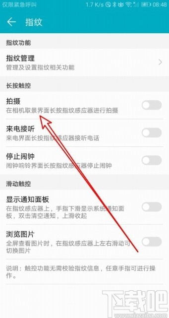 4.接下来在指纹设置界面就可以看到有一个拍摄功能了,点击这个功能右边的开关,将功能打开之后就可以通过指纹感应来进行拍摄。