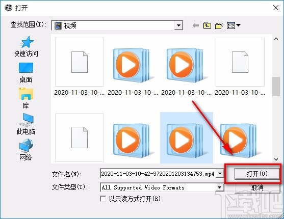 2.在文件添加页面中,我们选中需要添加文字水印的视频后,再点击页面右下角的“打开”按钮就可以了。