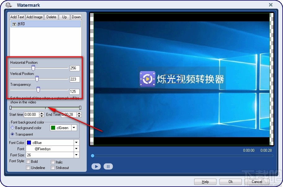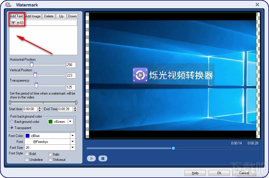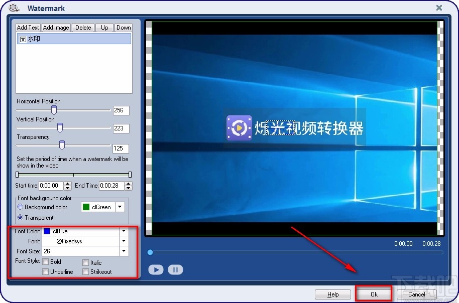 8.在界面左下方还可以找到“Font Color”、“Font”、“Font Size”等选项,分别表示字体颜色、字体、字号的意思,可以利用这几个工具对水印的相关参数进行设置;并点击窗口右下角的“OK”按钮即可返回到软件主界面。