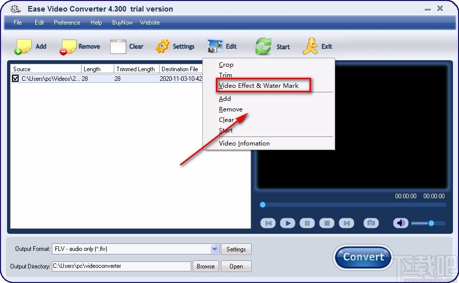 3.将视频添加到软件后,我们在界面上方找到“Edit”选项并点击,其下方会出现一个下拉框,在下拉框中选择“Video Effect&Water Mark”选项。