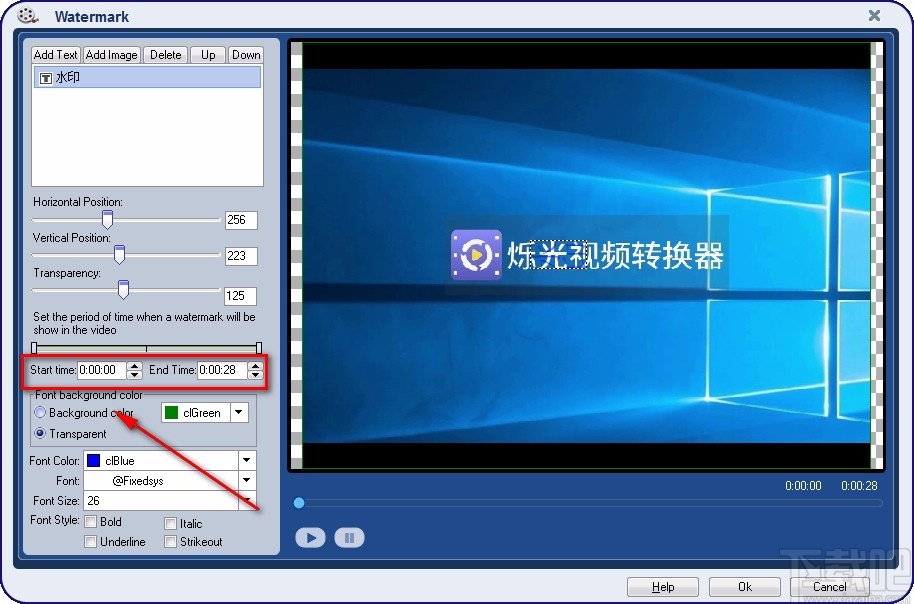 6.然后在界面左侧找到“Start time”和“End Time”选项,我们分别在两个选项后面的文本框中输入时间数值,来设置水印在视频中出现的起始时间以及结束时间。