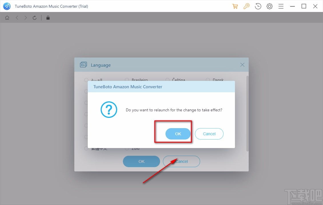 4.接下来界面上就会出现一个提示窗口,提示我们是否重启软件使语言设置生效,我们点击窗口中的“OK”按钮就可以了。