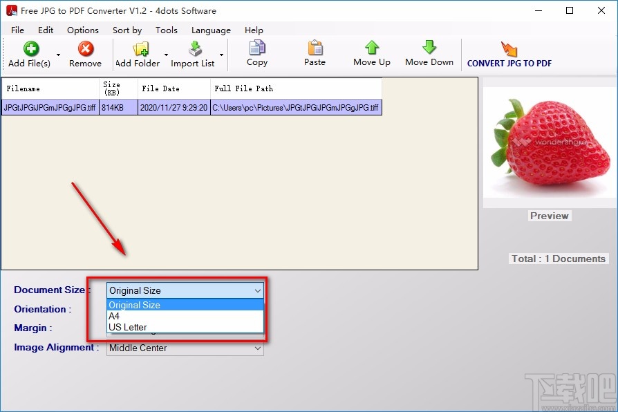 3.将PDF文件添加到软件后,我们在界面左下方找到“Document Size”选项,该选项表示文件尺寸的意思,点击该选项后面的下拉按钮,在下拉框中设置文件尺寸。