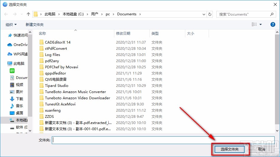 4.随后界面上就会弹出一个文件保存路径选择页面,我们在页面中选中文件的保存位置后,再点击页面右下角的“选择文件夹”按钮即可。