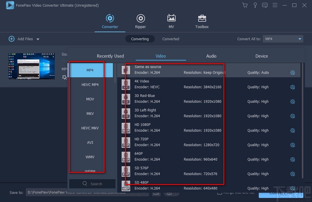 4.然后界面上就会出现一个视频格式选择窗口,我们在窗口左侧选择视频的具体格式,并在窗口右侧选择视频的分辨率。
